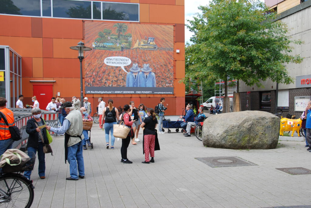 Seit zwei Jahren beschäftigt sich die Initiative „Neugraben fairändern“ mit den 17 Nachhaltigkeitszielen der Vereinten Nationen. In diesem Sommer geht es um das Nachhaltigkeitsziel Nr. 1: „Armut in jeder Form und überall beenden“. Am 17. Juli wurde das Wandbild, das vom Künstler Eckart Keller zu diesem Thema gestaltet wurde, an der Außenwand des Kaufland-Gebäudes in Neugraben montiert.