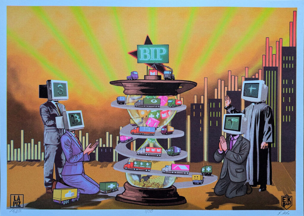 Die intensive Beschäftigung mit dem BIP und dem Lieferkettengesetz resultierte in einem weiteren Motiv von LAPIZ mit dem Titel „Fortschrittlos – No Progress“, das in Berlin im Urban Canvas Parkhaus zu sehen ist (kuratiert von „Liebe zur Kunst”).